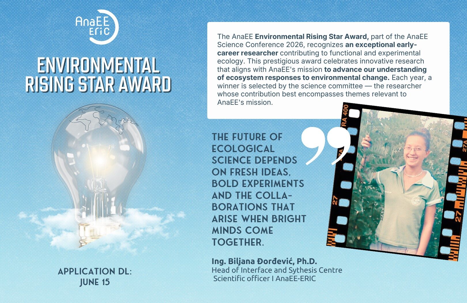 The AnaEE Environmental Rising Star Award, part of the AnaEE Science Conference 2026, recognizes an exceptional early-career researcher contributing to functional and experimental ecology. This prestigious award celebrates innovative research that aligns with AnaEE’s mission to advance our understanding of ecosystem responses to environmental change. Each year, a winner is selected by the science committee — the researcher whose contribution best encompasses themes relevant to AnaEE’s mission.